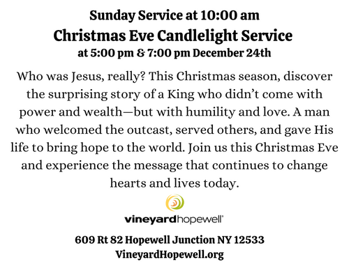 Vineyard Community Church in Hopewell Junction, NY is a place where people can meet Jesus, engage in life-giving community, and everyone is welcome. We believe in creating a space where people can have authentic encounters with Christ, discover their gifts and use them for God's glory.
